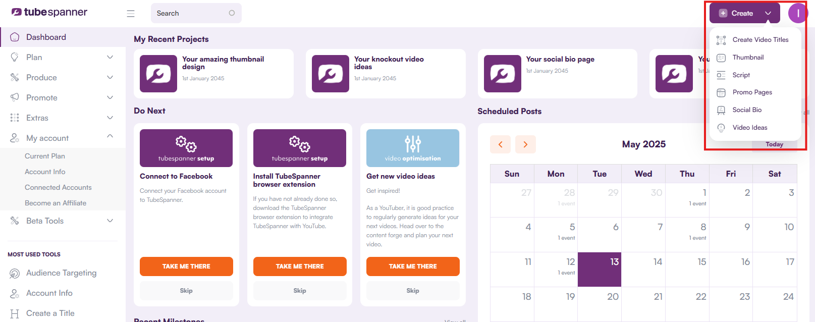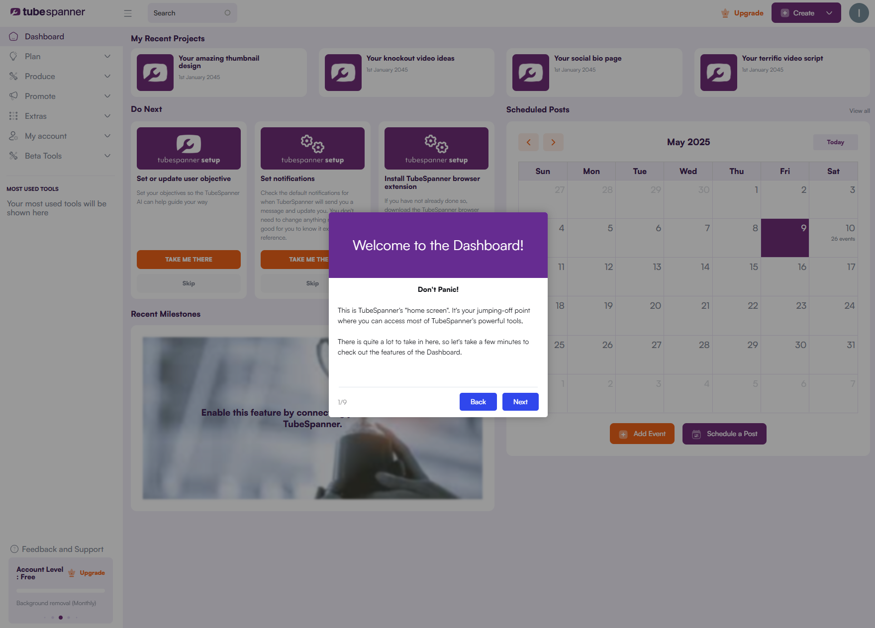 1. When you sign up for TubeSpanner, you'll be taken to the onboarding process. After you're finished with the onboarding, you'll be greeted with a quick walkthrough of the dashboard.