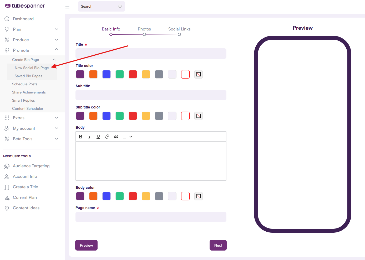 2. TubeSpanner provides a suite of promotional tools, so you should begin with your Social Bio Page. Head there by clicking on the Promote tab, Create Bio Page, and then New Social Bio Page.