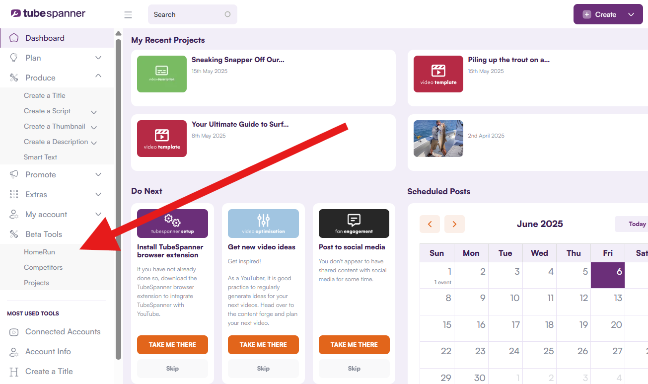 To begin optimizing your video you will need to be logged into your TubeSpanner account.  You can access the TubeSpanner tools under the Beta Tools dropdown menu at app.tubespanner.com/dashboard (left hand menu)or by going to the Video Details page in your YouTube Studio Dashboard and selecting the Homerun option from your TubeSpanner tab menu: