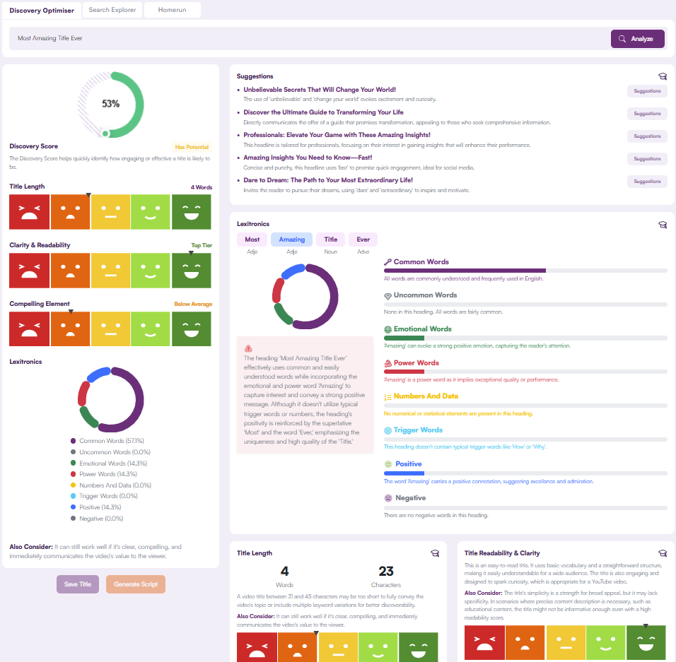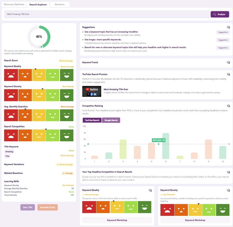 TubeSpanner’s Homerun tool provides you with three options for maximizing your video SEO. These are the Discovery OptimiserSearch Explorer and Homerun. You can enter your video title into each of these tools to see different insights into the SEO aspects of each.